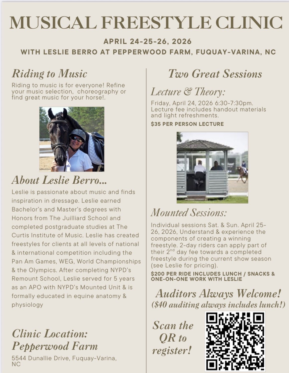 We are excited to announce a Musical Freestyle Clinic on the weekend of 24-26 April 2026 at Pepperwood Farm, in Fuquay-Varina, NC. Our clinician is Leslie Berro, who has multiple clients competing at all levels of dressage. This is a wonderful opportunity to explore a musical freestyle or just find the right music to highlight your daily rides. Clinic features a Fri. 24-April-2026 evening lecture and a mounted clinic Sat. and Sun. 25-26-April-2026. What a great time to create a musical freestyle for the show or championship season!